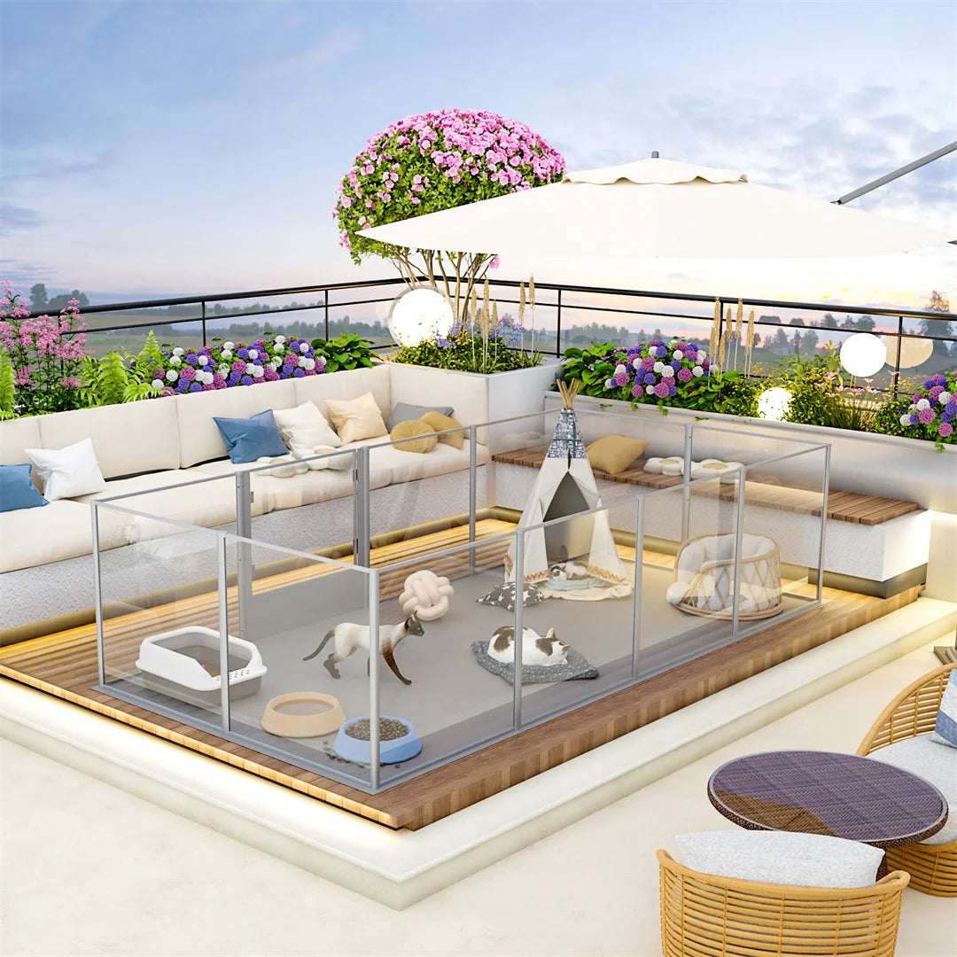 【Clear Acrylic Fence Design】Crystal-clear acrylic dog fence playpen enables you can interact with your pets closely, 360°high transparency and wide vision, it’ll relieve your pets from anxiety, they also make sure you are by their side, equipped with a door for dog mom/ pets to come and go easily, so this is a unique gift for your loved friends, get this versatile fence in the room, instantly elevating your home spaces