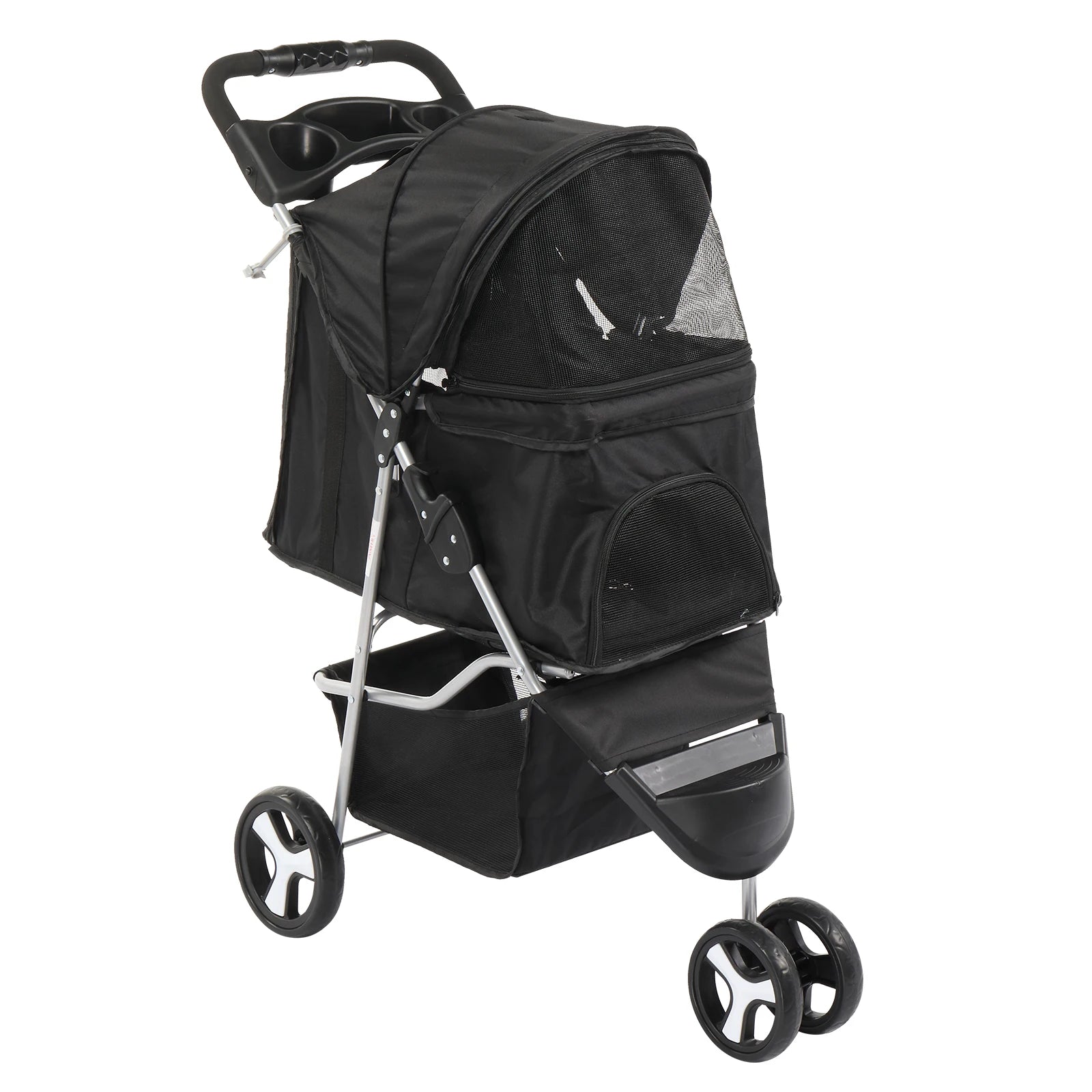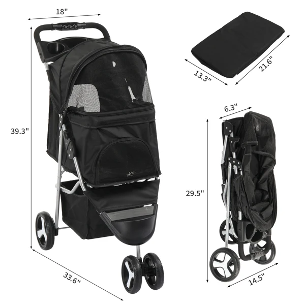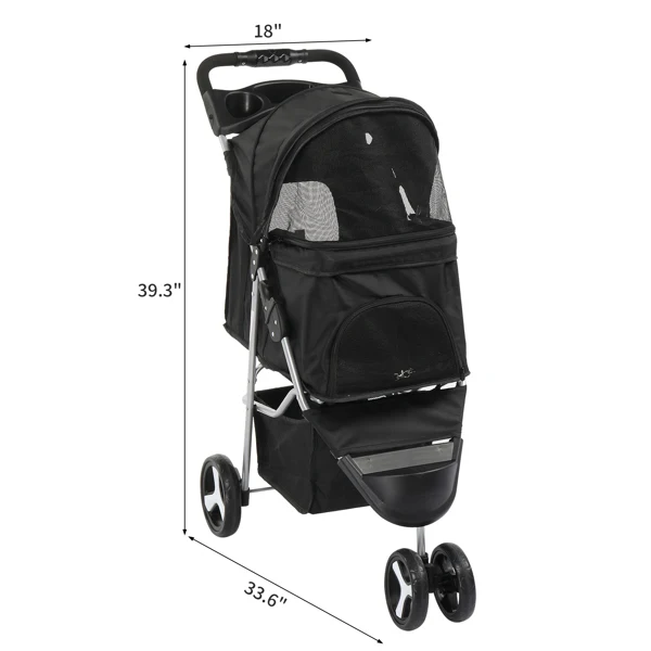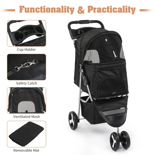 3 Wheels Pet Stroller, Dog Cat Cage Jogger for Med/Small Pets, Foldable & Waterproof Travel Carrier with Cup Holder.