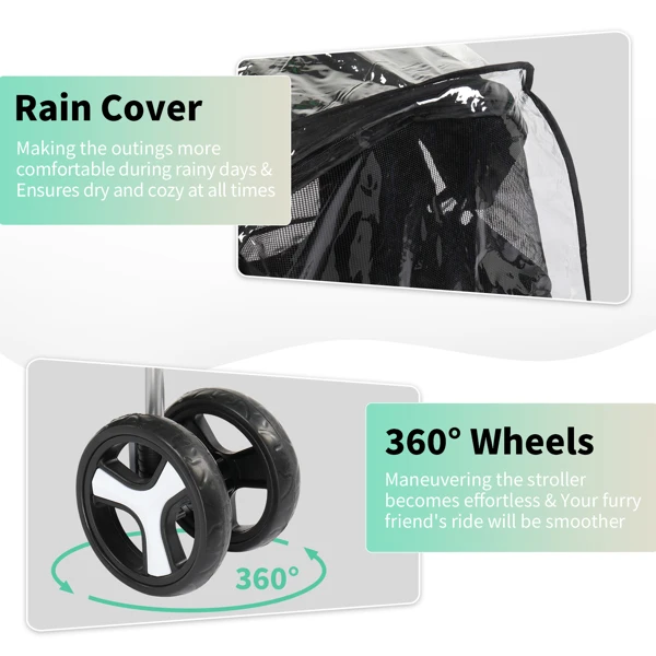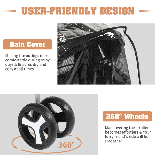5. Robust and Weather-Ready: Constructed from durable oxford fabric and supported by a sturdy steel frame, our pet stroller is designed to withstand the elements, complete with a waterproof cover for all-weather escapades.